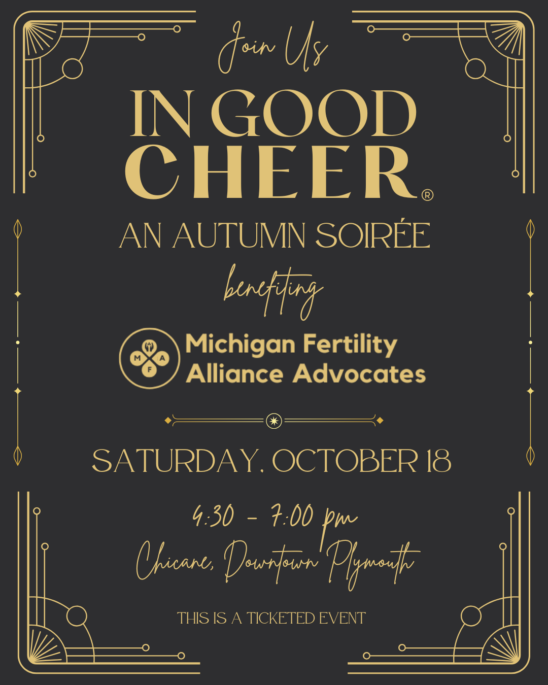 Join Michigan Fertility Alliance Advocates for our debut fundraising event on Saturday, October 18, 2025 at Chicane in Plymouth, MI. This casually elegant evening will celebrate the passage of the Michigan Family Protection Act and raise critical funds to protect and expand access to fertility care in Michigan. Guests will enjoy passed hors d'oeuvres, canapés, a charcuterie and dip spread, small-bite desserts, and spirits from Iron Fish Distillery, including a private tasting with an Iron Fish mixologist. The night will feature a curated silent auction, lively conversation, and the chance to connect with fellow advocates for pro-family, pro-fertility legislation.