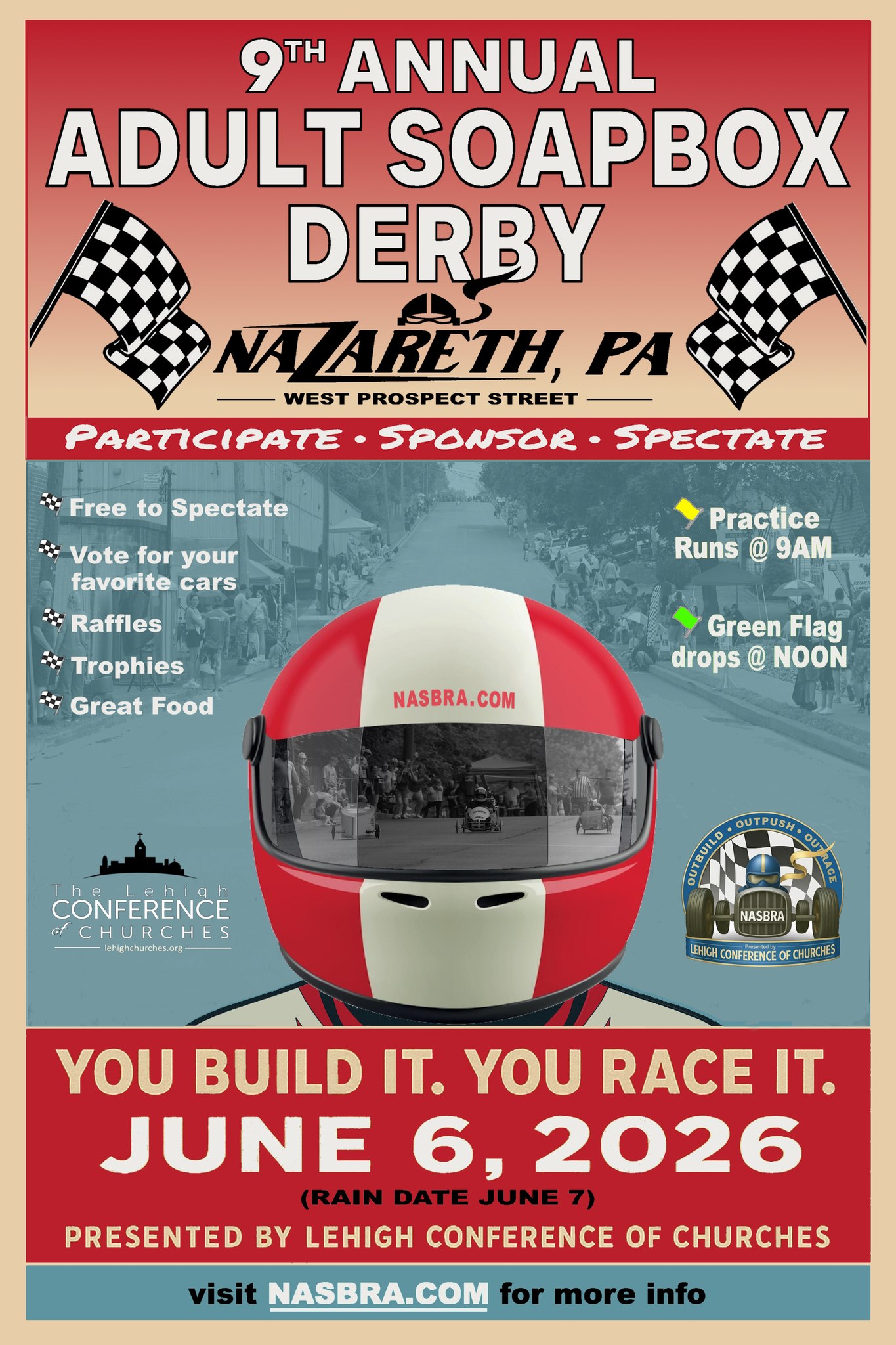 We’re excited to announce the 9th Annual Nazareth Adult Soap Box Racing Association event, set for Saturday, June 6th, 2026! This year, we’re bringing back the thrill of gravity-powered racing on West Prospect Street with even more excitement and fun for all involved.