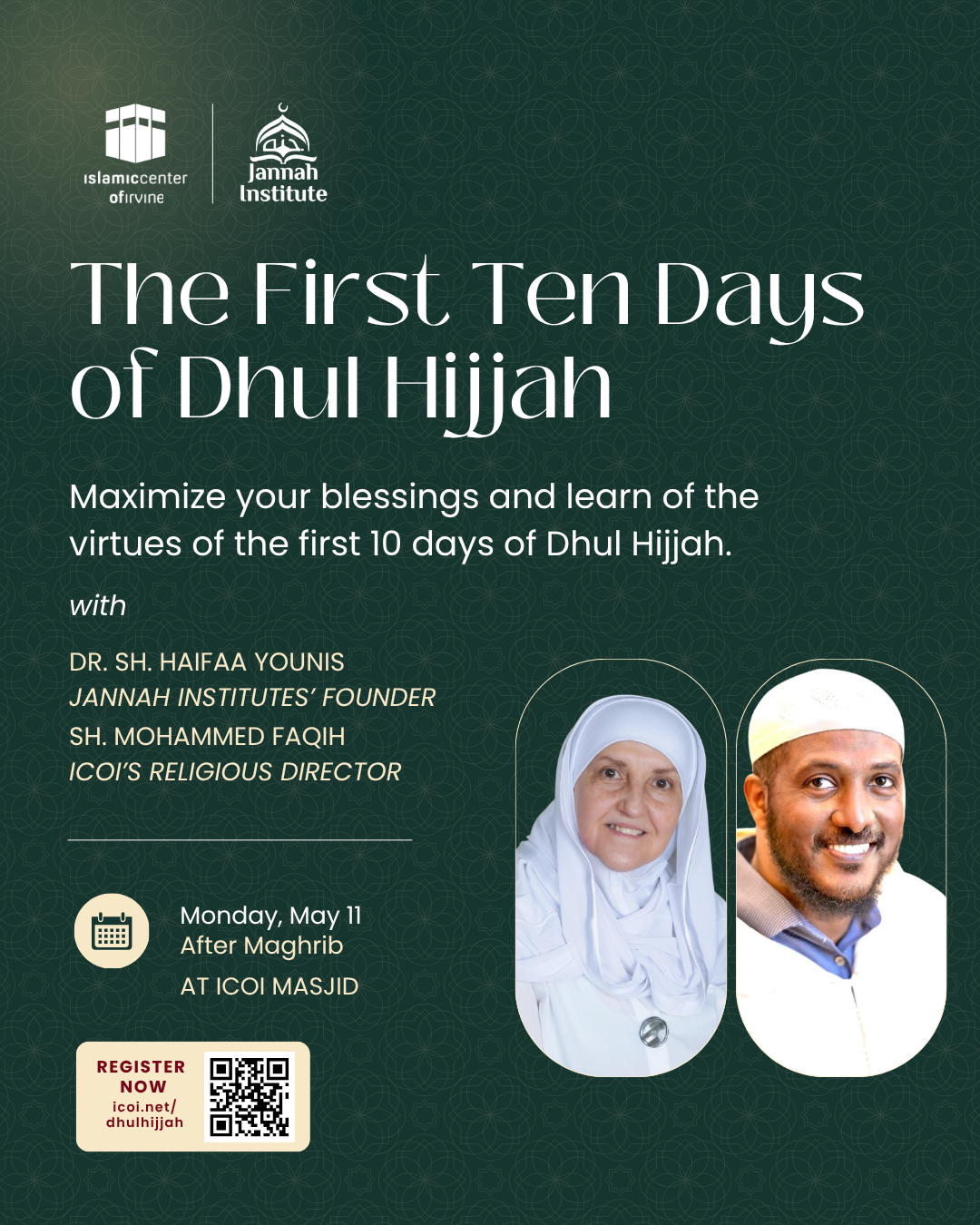 Join Dr. Sh. Haifaa Younis, founder of Jannah Institute, for an inspiring evening exploring the virtues of the first ten days of Dhul Hijjah. Discover practical ways to make the most of these blessed days and deepen your connection with Allah.