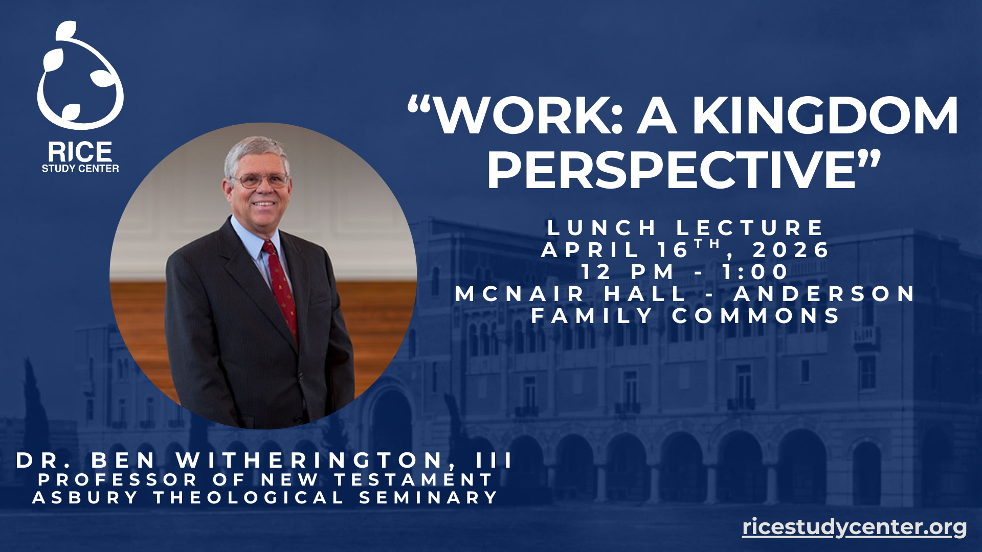 Join faculty and graduate students for a lunchtime conversation on the theology of work with Dr. Ben Witherington, III, Professor of New Testament at Asbury Theological Seminary. In his talk, “Work: A Kingdom Perspective,” Dr. Witherington will explore how Scripture reframes vocation, ambition, and everyday labor in light of God’s reign, with opportunity for Q&A and table discussion. Sponsored by the Rice Christian Study Center, this luncheon invites participants from all disciplines to consider how a Christian vision of work might shape their research, teaching, and life in the university; registration is required.