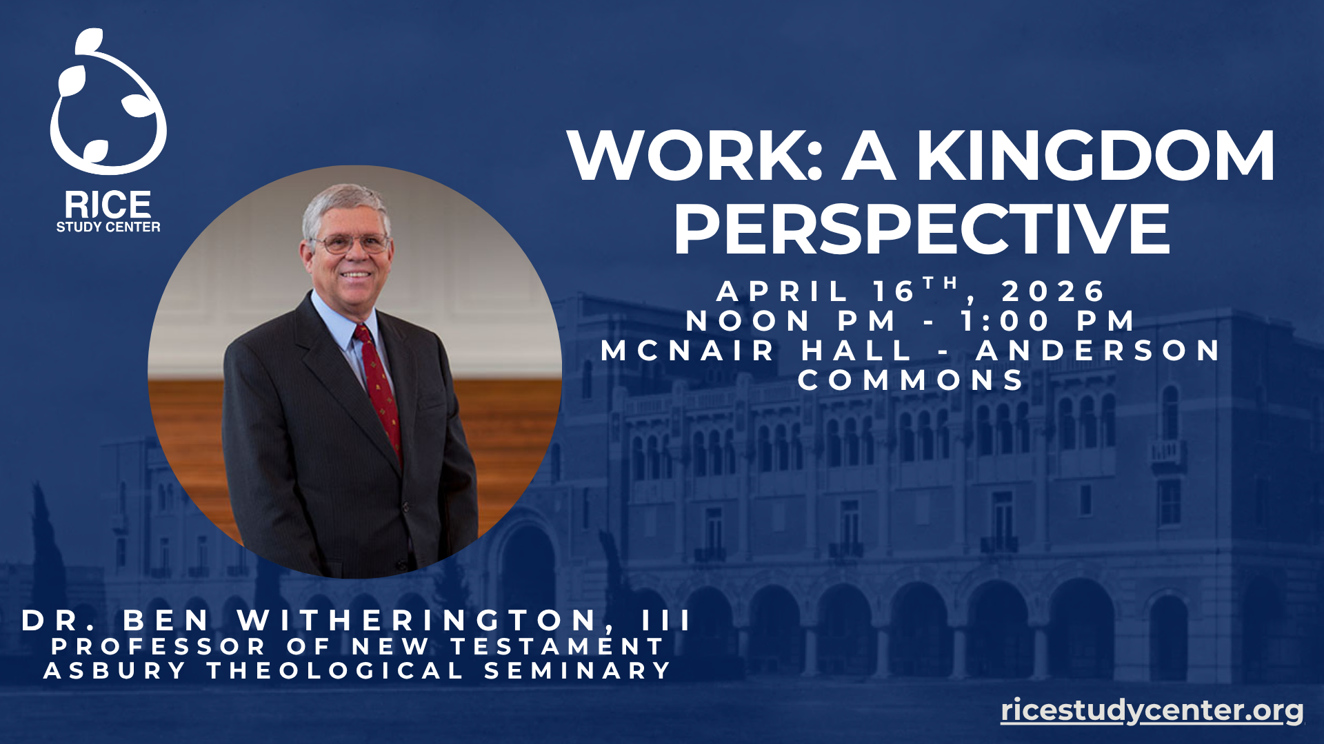 Join faculty and graduate students for a lunchtime conversation on the theology of work with Dr. Ben Witherington, III, Professor of New Testament at Asbury Theological Seminary. In his talk, “Work, Calling, and the Way of Jesus,” Dr. Witherington will explore how Scripture reframes vocation, ambition, and everyday labor in light of God’s reign, with opportunity for Q&A and table discussion. Sponsored by the Rice Christian Study Center, this luncheon invites participants from all disciplines to consider how a Christian vision of work might shape their research, teaching, and life in the university; registration is required.
