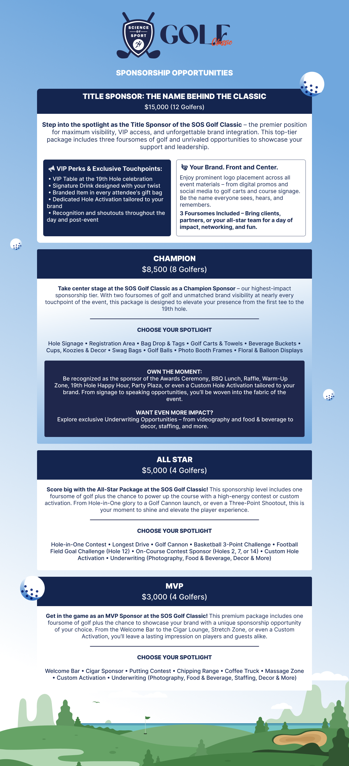 Whether you're slicing it into the fairway bunker, hooking onto the cart path, or bombing it down the middle, your day on the course will be a beautiful one as you help Science of Sport thrive.