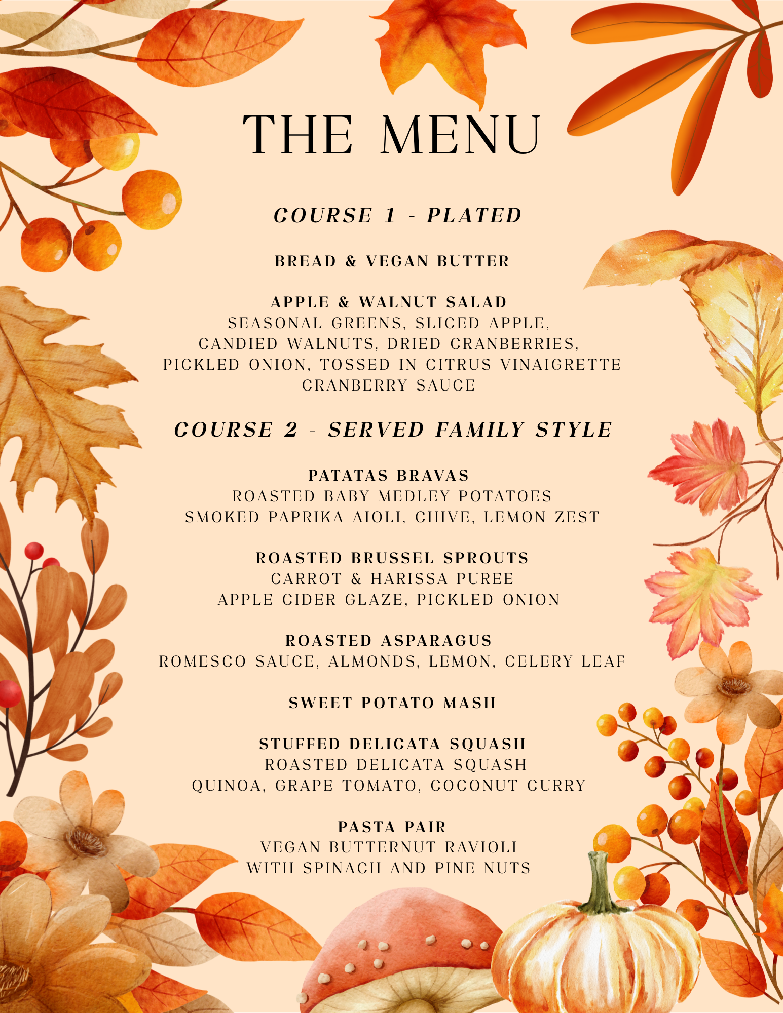 This event will start with an hour of hors d'œuvres and open bar, then move to a seated meal with a plated starter and then a family-style plant-based meal. The meal will close out with an array of vegan desserts.