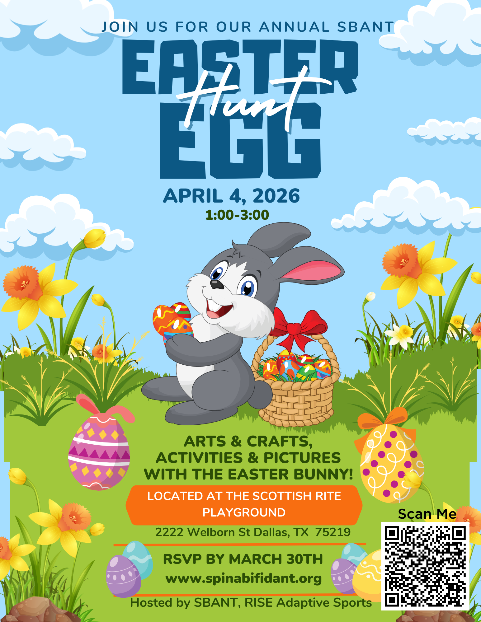Join us for an afternoon of fun, including arts & crafts, pictures with the Easter Bunny and of course, an Easter Egg Hunt at Scottish Rite for all of our Spina Bifida families! Come play on the accessible playground and meet some new friends. We hope to see you there! Hosted by RISE Adaptive Sports. This year it will only include SBANT families.
