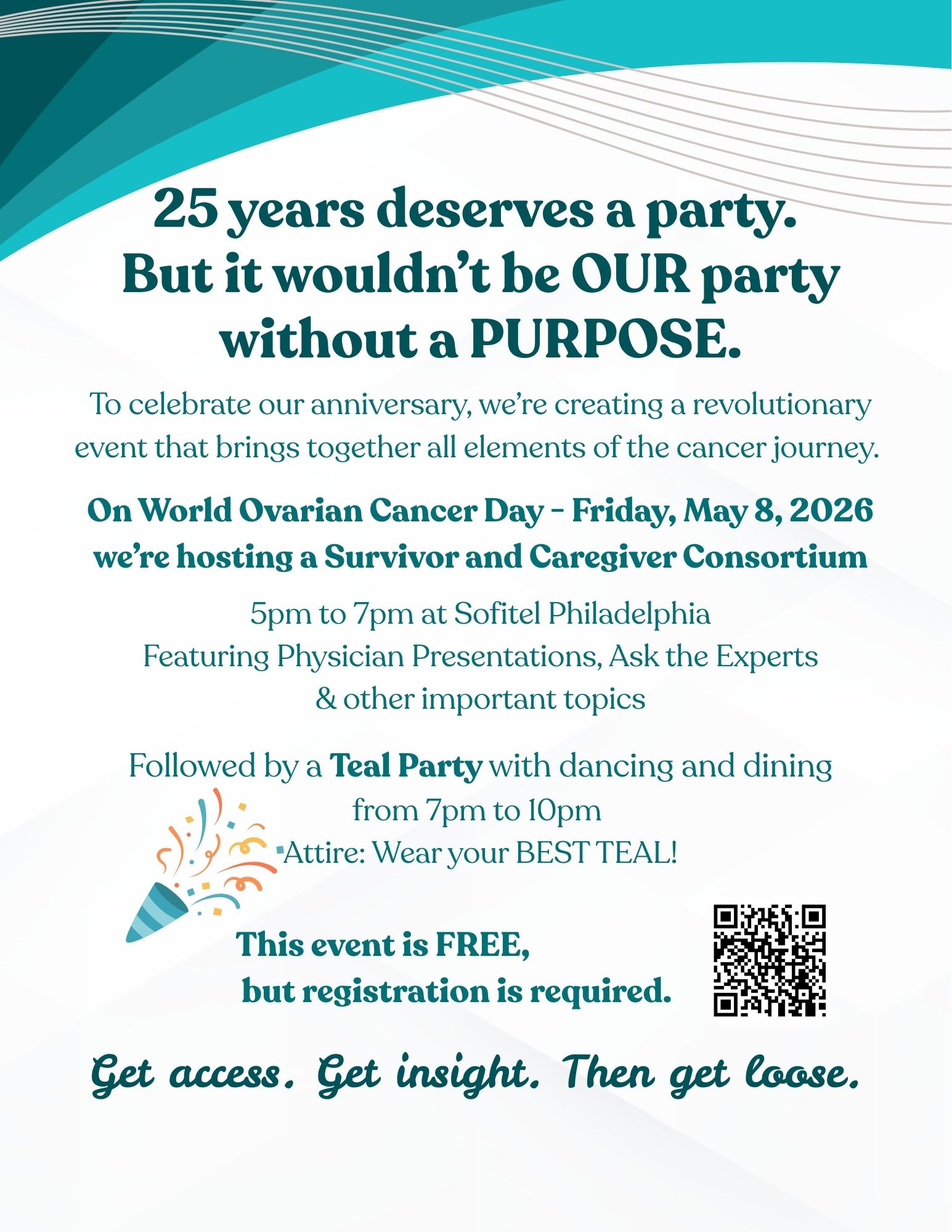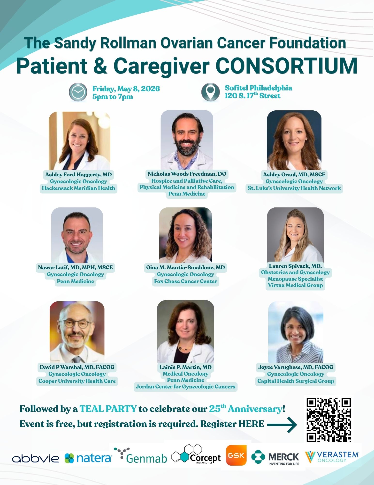 Please Join us for a Survivor & Caregiver Consortium from 5PM to 7 PM followed by a Teal Party. Both events are FREE and Valet Parking is included. You can attend both events or one of them, but you must pre-register.