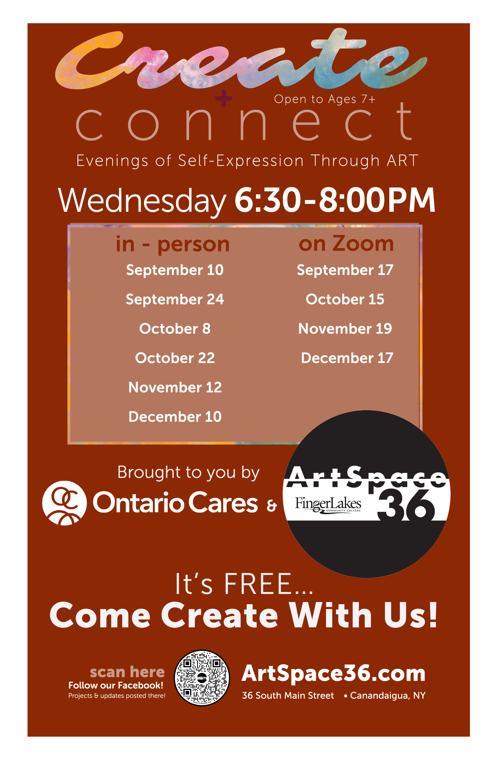 Both programs are held at ArtSpace 36 in Canandaigua and offer a safe, welcoming environment to explore art, share ideas, and connect with like-minded people.