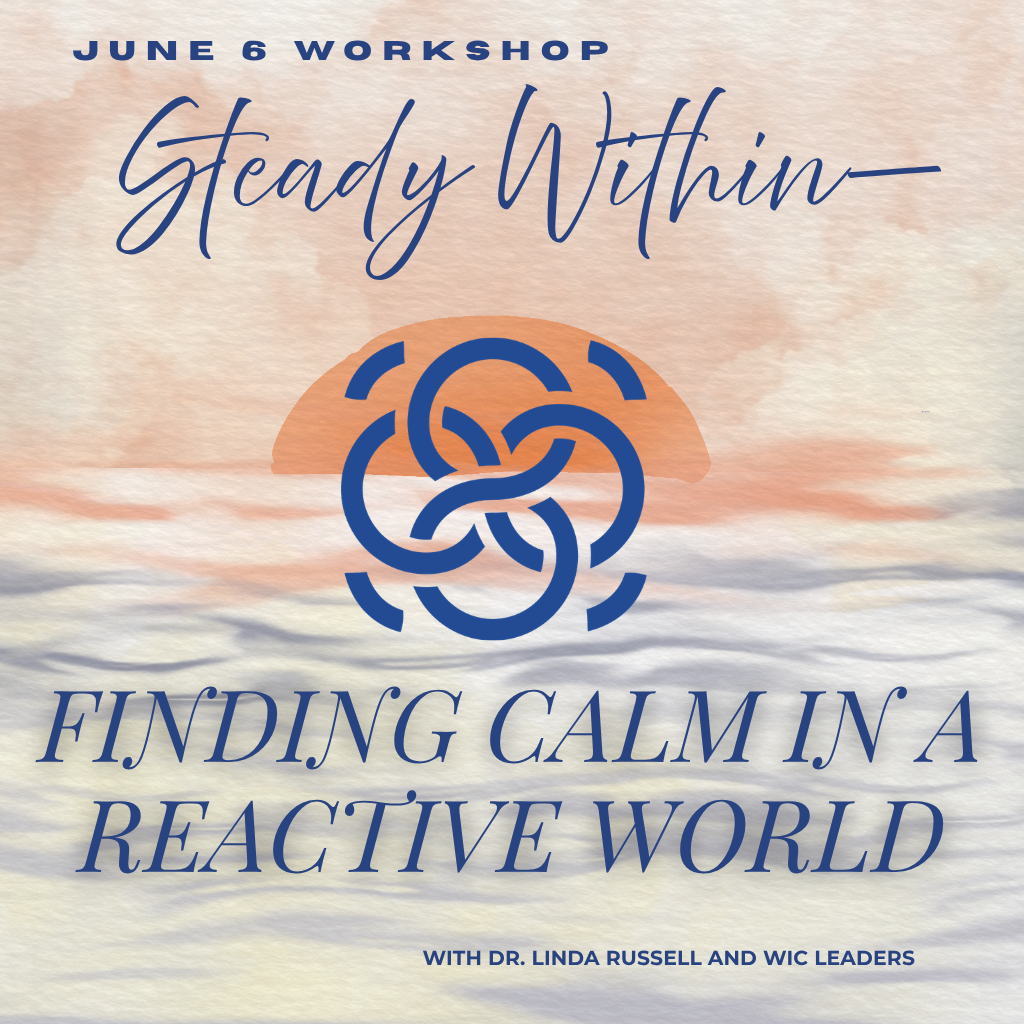 Mark your calendars for our June 6 Workshop: Steady Within—Finding Calm in a Reactive World with Dr. Linda Russell and WIC leaders. Dr. Linda is an educator, trainer, and therapist who works with people towards trauma resolution. Trauma permeates social and personal environments, creating a constant alarm vigilance in our nervous systems. Learning to regulate our nervous systems helps us with self-management and enables us to experience inner calm. Join us for this highly informative workshop!