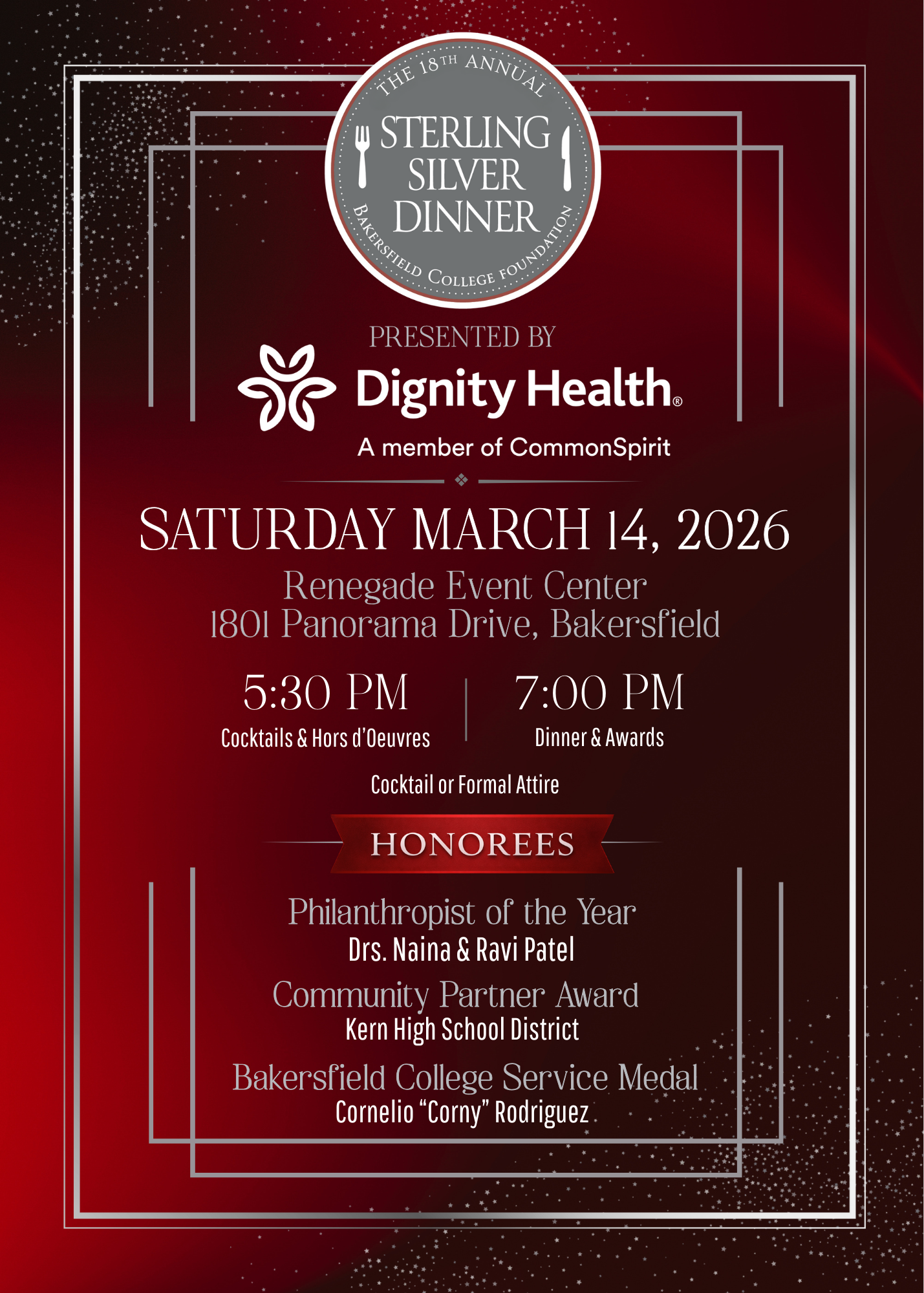 This multi-course dining experience and awards ceremony is always a sellout, bringing together community leaders, philanthropists, and supporters of Bakersfield College. The Sterling Silver Gala is held in the Renegade Event Center atop the new Campus Center building. A portion of proceeds benefit the Sterling Silver and the Culinary Arts Scholarships.