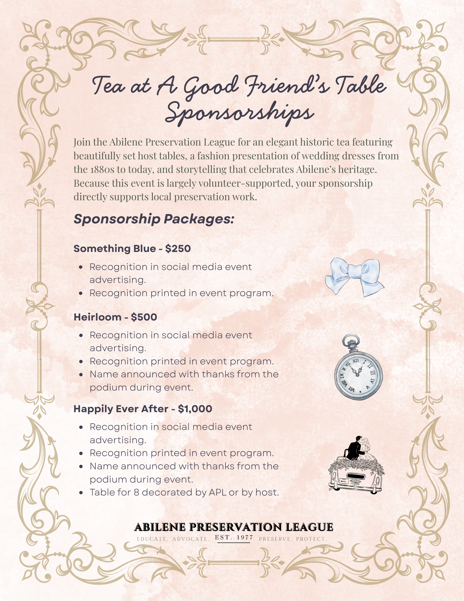 Your generous support helps to sustain the Abilene Preservation Leagues meaningful work and aligns your name/business with a cultural event celebrating history, beauty, and community.
