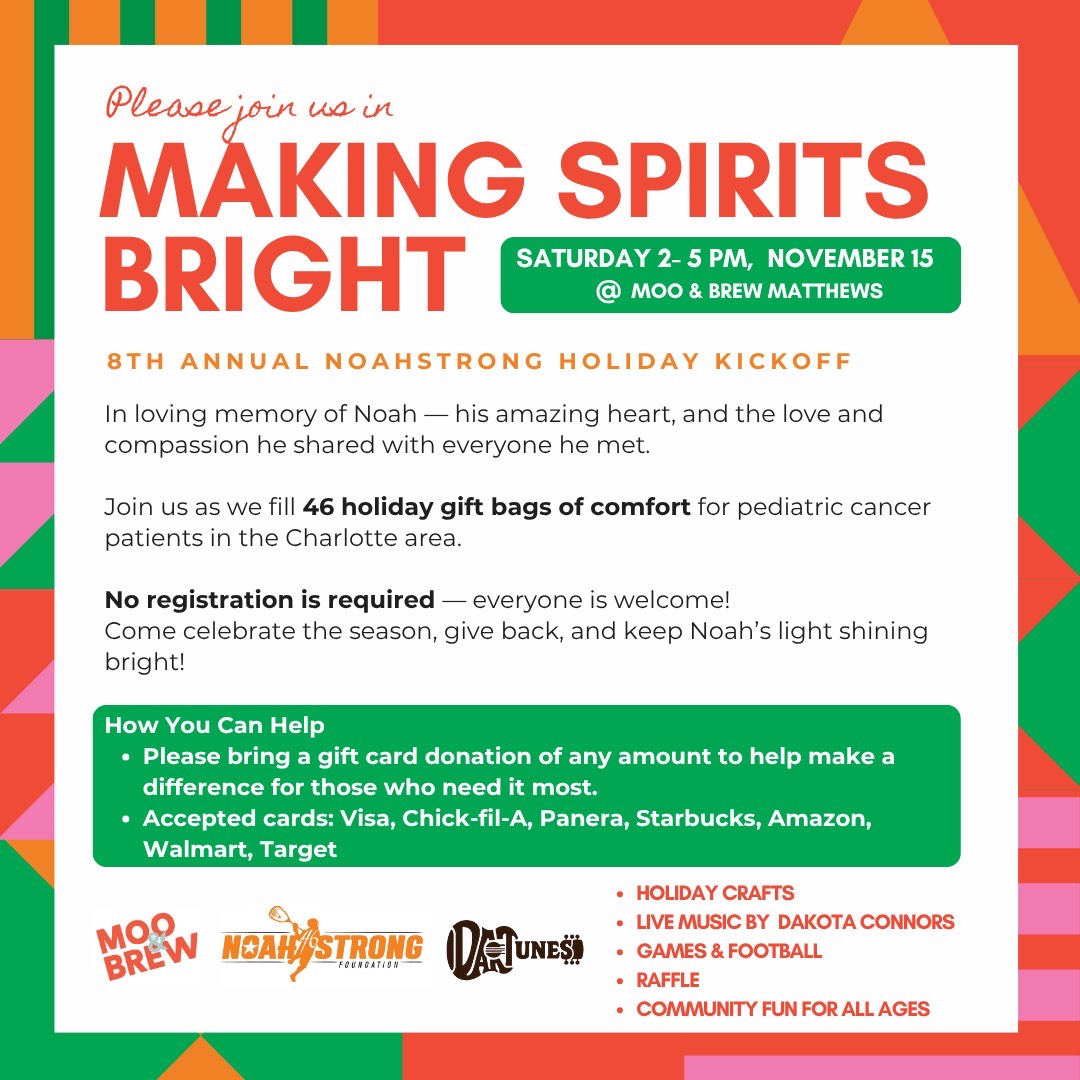 Join us for our 8th Annual NoahStrong Holiday Kickoff at Moo & Brew in Matthews, NC.