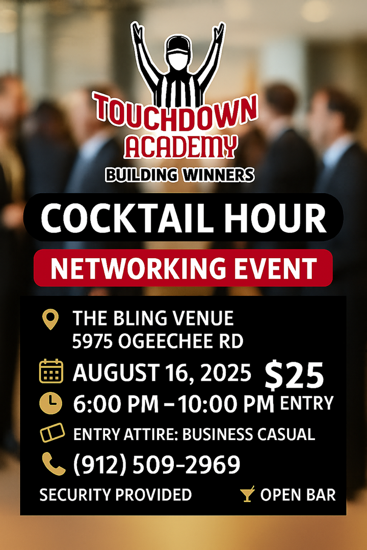 Touchdown Academy Inc. is hosting a Cocktail Hour Networking Event on Saturday, August 16, 2025, from 6:00 PM to 10:00 PM at Party Bling in Savannah.