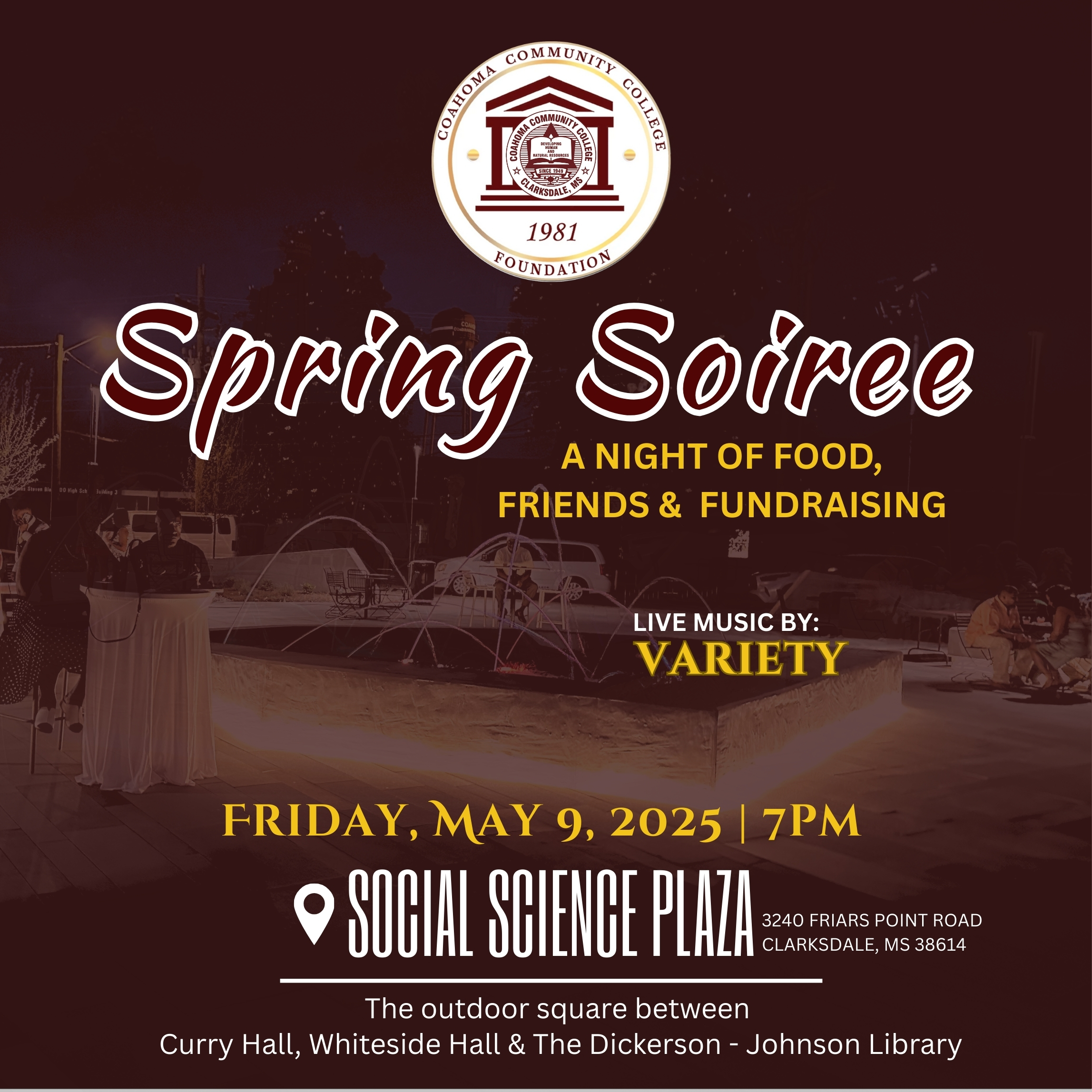 Join us for the Coahoma Community College Foundation's Spring Soiree on May 9, 2025, at 7 pm at the Social Science Plaza - a night of music, laughter, good vides and GREAT purpose!!