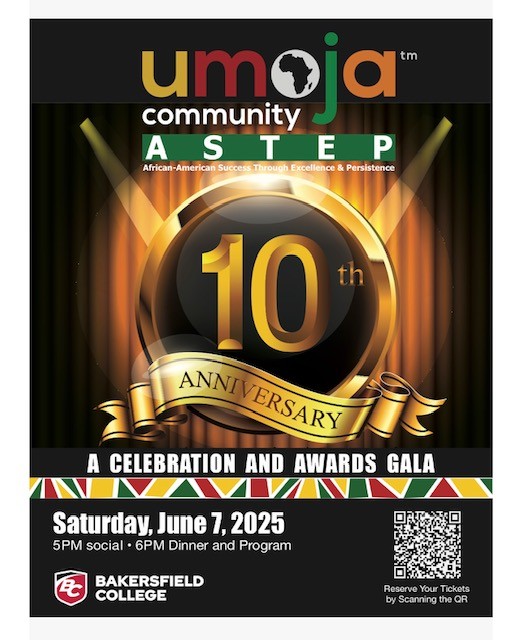 Umoja ASTEP at Bakersfield College will celebrate its 10-year anniversary and honor a former administrator who made it all possible, a special donor, a valued mentor, an outstanding Umoja BC student who has graduated, and a promising current Umoja BC student.